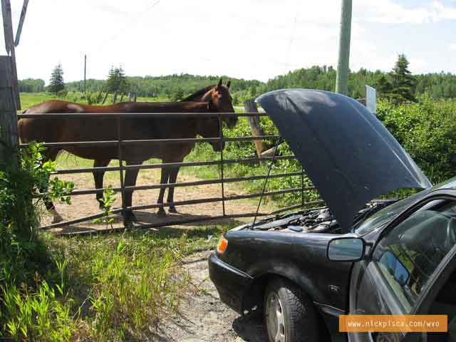 More... Previous day edit... Glenn wanted to mention that not only do the Ontario police take and destroy your radar detector at a cost, but they ALSO fine you $140! 270369. Sault Ste Marie, ON. 10:00pm Friday - 8:50am Saturday. We got into SSM pretty late and begun looking for a cheap hotel. The first place we visited asked for a pricey sum, and then justified it by saying “Michigan is right over there.” We didn’t get what he was saying, because we’ve been to Michigan, and it’s not a bargaining chip. We had an issue with some accelerated wear on the outside of the driver’s side tire. A professional alignment was done before the trip, but they must have missed something. The tires were even a little over-inflated, so the wear wasn’t due to the pressure being low. For diagnosis purposes, we decided to rotate the tires and see if the wear pattern progresses. However, this was not as simple as it seems, since our jack and spare were underneath the VO tank. It was an early morning of unloading the back of the car and extending the VO tank to the maximum extents of its umbilical. Added 0.5 cubes. 270385. west of Sault Ste Marie. 10:00am Saturday. Dispute was made over the missing beef sticks. It is evident that Glenn ate them and is blaming Nick for their absence. 270387. 10:05am Saturday. Beef sticks found under seat. 270502. Webbwood, ON. 11:30am Saturday. Added 11.4 gallons of Diesel. Sudden noticeable loss in boost (while driving and on gauges). Found the pump to be non-responsive and extremely hot. Also, it wasn’t a fuse/electrical issue. We’ll drive in “safe mode” to Sudbury to find a new pump. 270558. Sudbury, ON. 12:55pm Saturday We stopped off at the museum Dynamic North to check out their mine tour. We had a good view of the Inco Superstack (second tallest structure in Canada, just under the CN Tower) and that crazy two-story nickel. 270568. Leaving Sudbury, ON. 4:00pm Saturday. Heading out of Sudbury, we stopped off at a home supply store to see if we could rig up something to cool the pump. We found some flexible plastic hosing that could suck air from outside the car. It’s a makeshift solution, but should get us around. 270573. Trans-Canadian Hwy. 4:30pm Saturday We encountered the same pressure problem and found our VO pump to be functioning intermittently. It’s an inexpensive all-purpose fuel pump from a typical auto parts store, and it lasted several thousand miles, so maybe it’s fried. After several miles on Diesel, we got a check engine light, forcing us to immediately pull over. There was a strong Diesel smell and a small drop trail down the road. Turns out, we forgot to stop the manual purge when we got some VO pressure issues, which overpressurized the fuel lines. We attacked the fuel issues from several angles, verifying and removing filters, replacing and checking hoses, relieving pressure in lines, and cleaning up the engine compartment. It appears that the air hose had provided a cooler environment for the fuel pump, but one of our fuel filters may have been overstrained. All filters had reasonable, but restricted flow. We’re headed to Sturgeon Falls to buy a new pump and get spare filters. After letting the current pump cool for a few minutes, it will function for dozens (or more) miles, so it may last longer than expected. While on the side of the road, a couple horses stopped by to supervise the maintenance. 270606. Sturgeon Falls, ON. 5:10pm, Saturday. Stopped off at a Sturgeon Falls Canada Tire to see if they had fuel filters and fuel pumps. Turns out they had neither (of what we needed). Those places are pretty worthless, because this was the third CT we’ve been to and they all didn’t have anything we ever needed. The only thing we bought was a pair of sunglasses that broke an hour after purchase. Later, Glenn remarked, “The only good thing about Canada Tire is to go in and ask where a real auto parts store is.” North Bay, ON. Saturday. On the way to Ottawa. 270708. Clifton, ON. 7:48pm, Saturday. VO pump still working fine with the air cooling. Along the Trans-Canadian Hwy. 8:28pm Saturday. Random image of the sunset on the TC Hwy. Ottawa, ON. 10:30pm, Saturday We had a few minutes to stop off in downtown Ottawa. 270859. Vars, ON. 11:30pm, Saturday. Added two cubes. __________________ -Nick Pants Pocket Saver (Tape Measure Holder) "I'd put that oil in my body, but not my engine." |