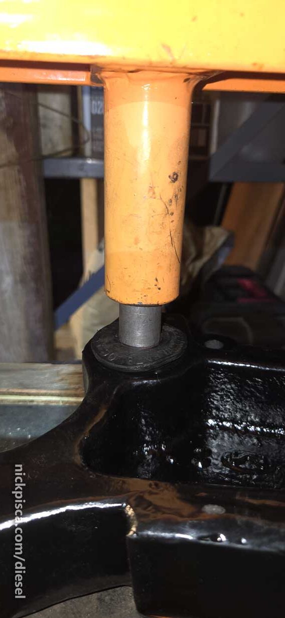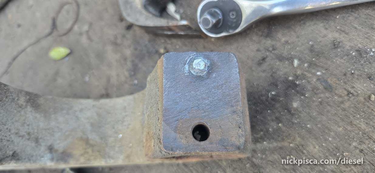 First things first. Let’s get that busted bolt out before working on bushings. My buddy Shawn tried to weld a nut on that bolt about four times, and we never could get it
