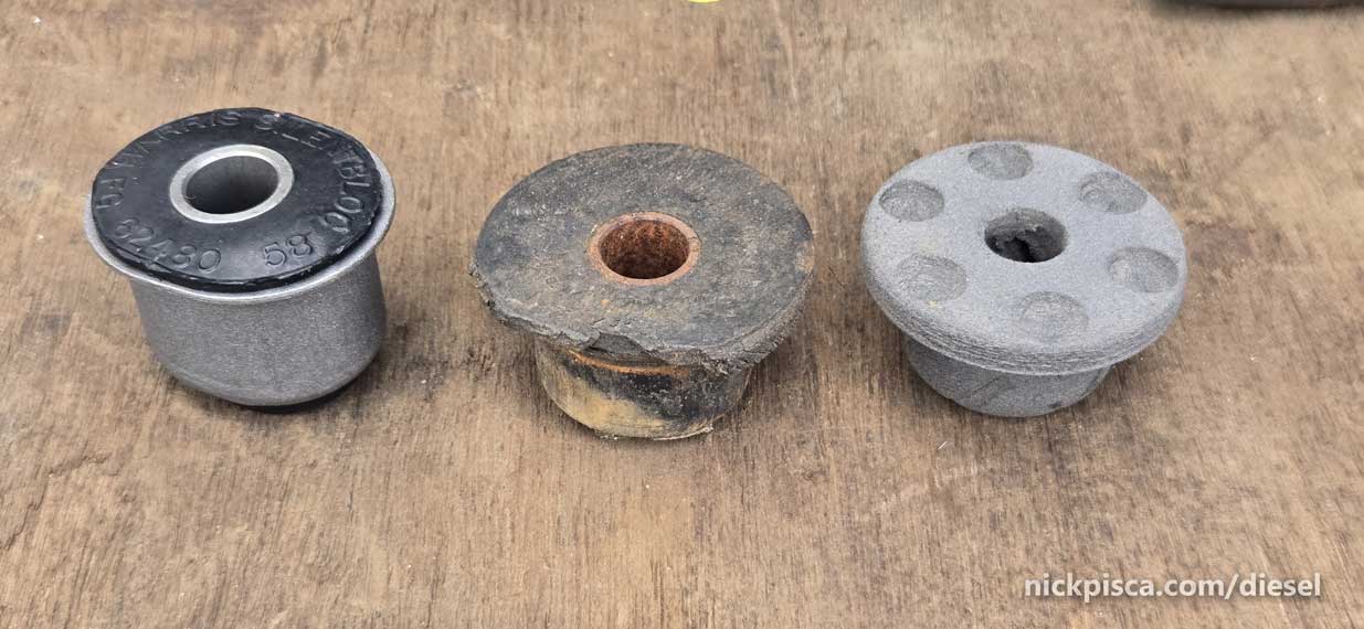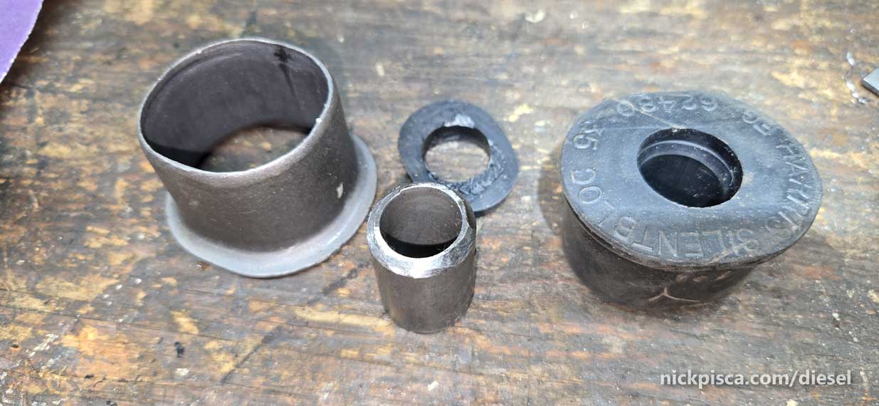 In the center, this is the Lord Kinematics old bushing from 1979. I can’t find it anymore. On the right, is a custom DIY 3D printed bushing, designed by me and printed in high-strength nylon. Lastly on the left, this is a bushing that I found on Rock Auto that was very close to my needs, but maybe I can modify it to work.
