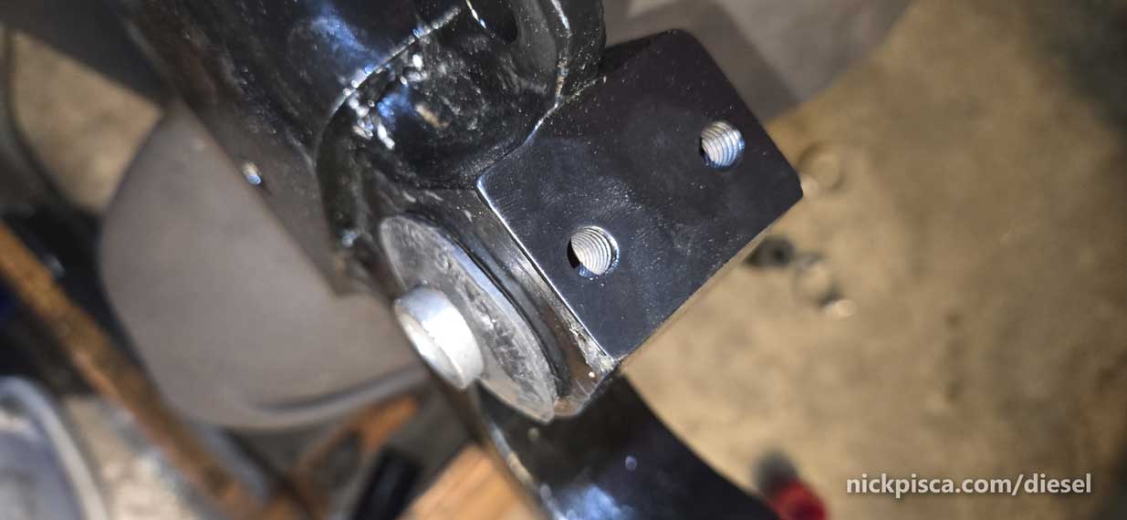 Now, I’m left with using the tap and die set to cut a bigger threaded hole. (I wire-wheeled, primed, and painted the radius arm before attempting the new threads)