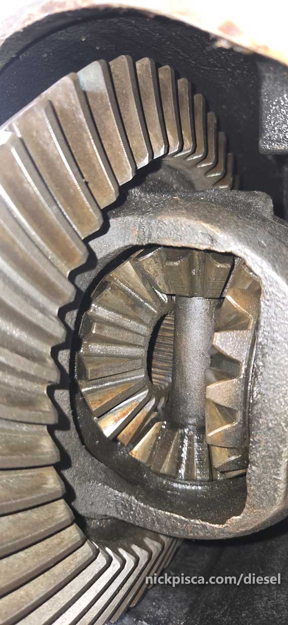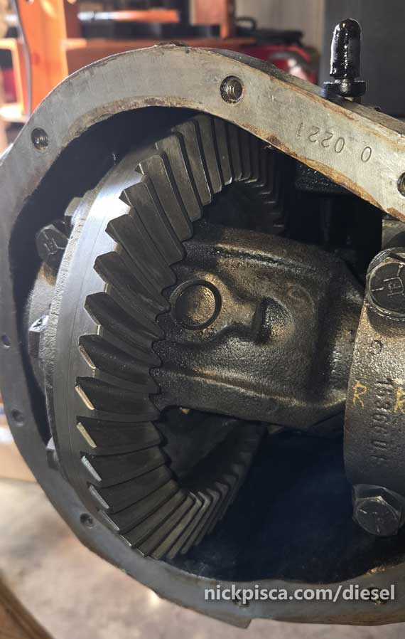 Since I’m retrofitting a Dana 44 front axle on a non-4×4 Econoline Diesel F250 Clubwagon, there isn’t a chart for me to figure out my current pinion gear ratio in the donor Quadravan axle.