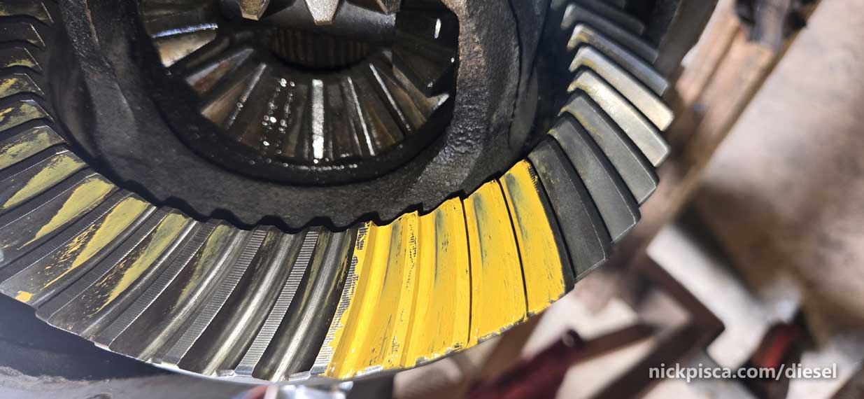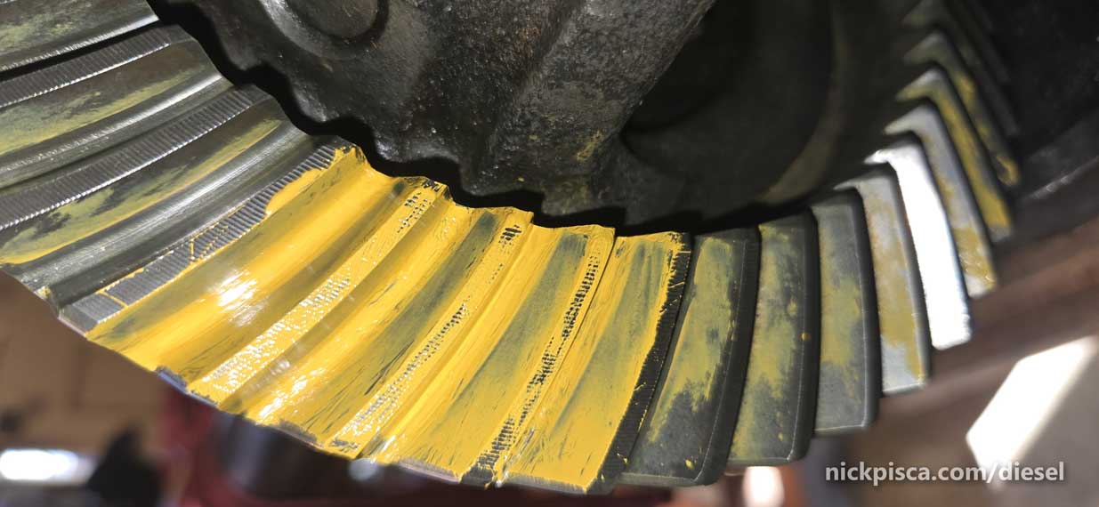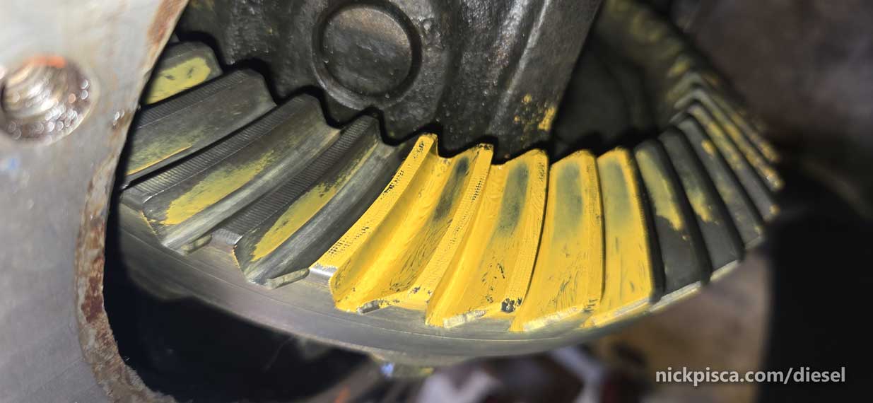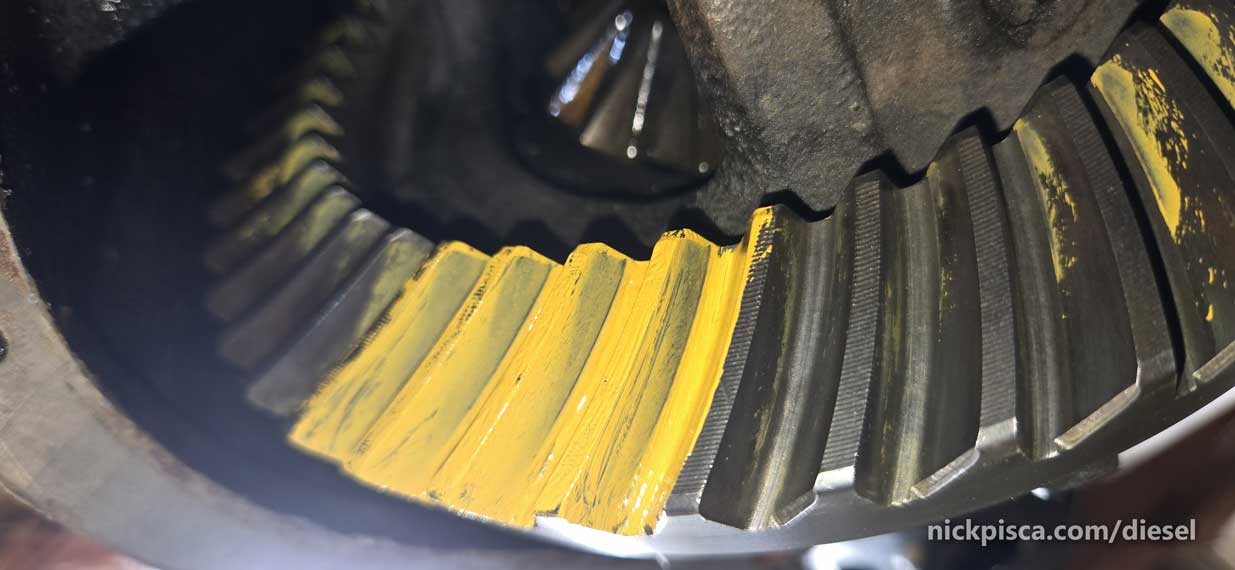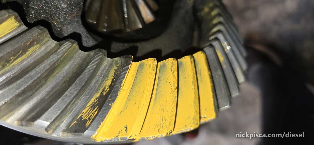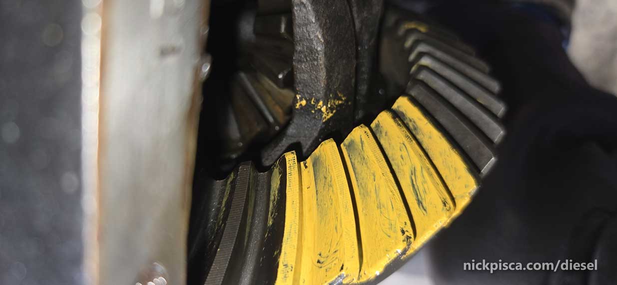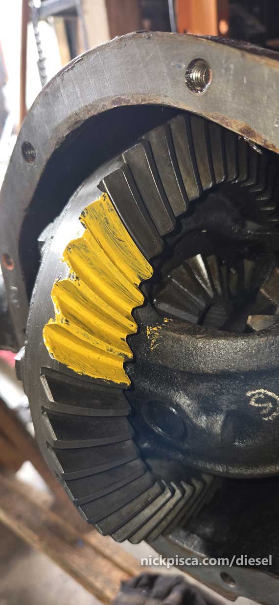 Alright, what’s the deal with the paint pattern. Basically, you have to use a thick paint (that should come with your differential rebuild kit) to check the way the gear mesh up.